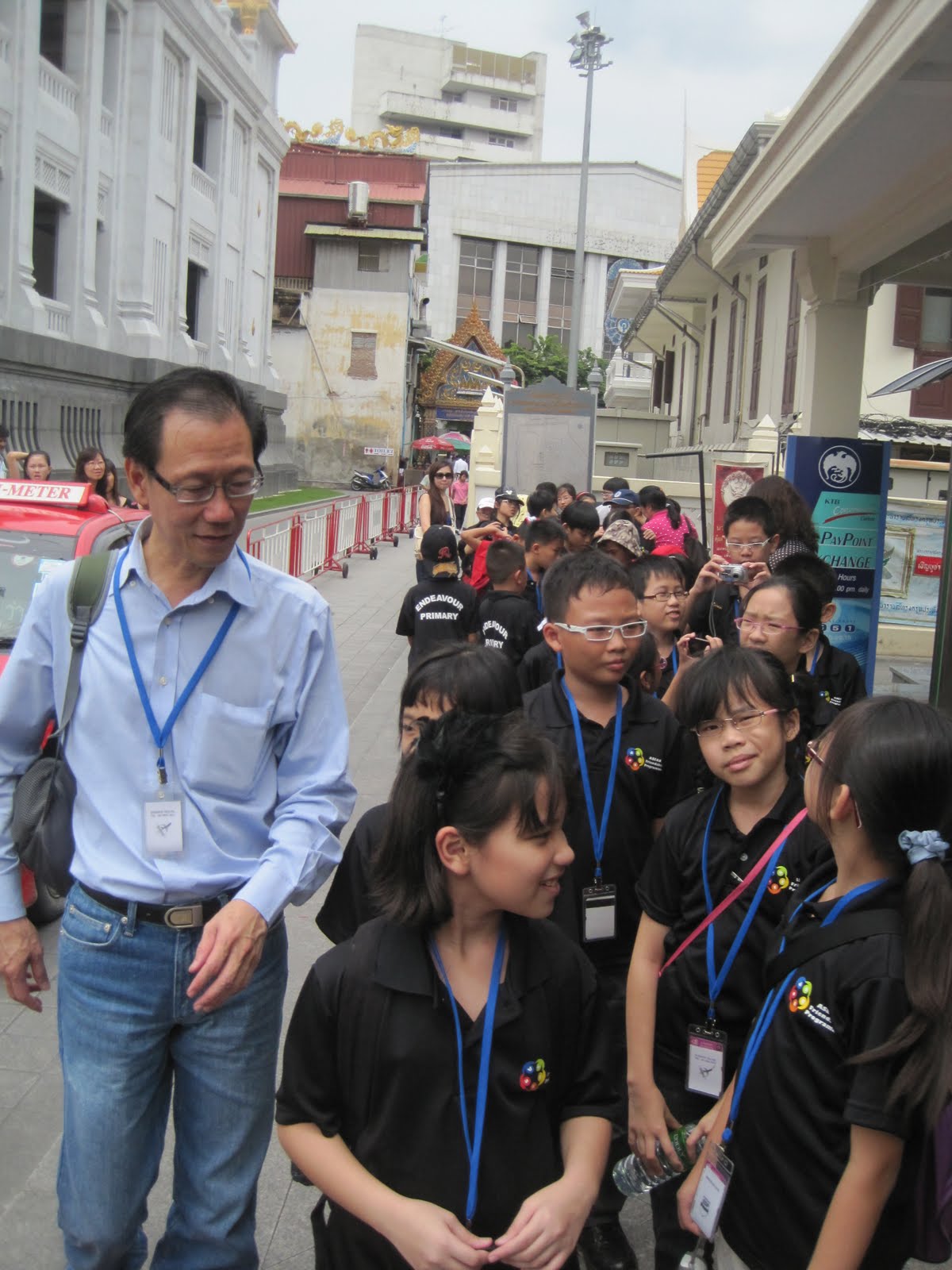The Temple of the Golden Buddha features a three meter high solid Buddha, weighing 5.5 tons. The temple is located right in the heart of Chinatown in Bangkok. Before entering the temple premises, the pupils learned that they have to remove their shoes and caps.